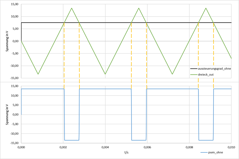 Linke Grafik zeigt das Ausgangssignal des spannungsgesteuerten PWM Generators bei einer angelegten Vergleichsspannung UV4 von 7,5 V, hier waagerecht in Schwarz eingezeichnet. Der Komparator vergleicht das Dreiecksignal (grün) mit der Vergleichsspannung (schwarz). An den Schnittpunkten der beiden Signalverläufe schaltet der Komparator jeweils seine Ausgangsspannung um und erzeugt somit das gewünschte PWM Signal (blau).