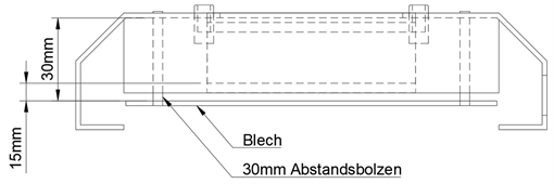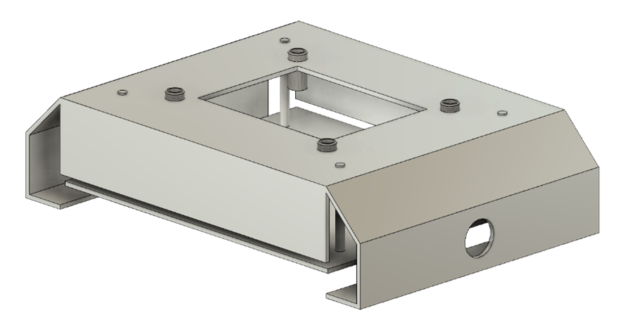Der Heizblock soll im zusammengebauten Zustand, ca 2 mm aus dem Gestell herausragen damit die Klemmvorrichtung und die DUTs nicht thermisch mit dem Gestell selbst verbunden werden kann. Um Gestell und Heizblock thermisch möglichst gut zu entkoppeln ist der Ausschnitt jeweis 2 mm um den Block herum größer. Der Heizblock wird durch Abstandsbolzen auf ein Blech geschraubt, welches ebenfalls mit Abstandsbolzen von der Oberseite des Gestells abgesetzt. Dies soll eine weitere thermische Entkopplung gewährleisten.